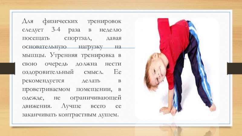 Слайд 3Для физических тренировок следует 3-4 раза в неделю посещать спортзал, давая