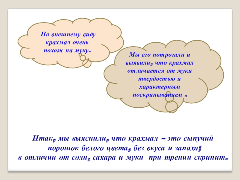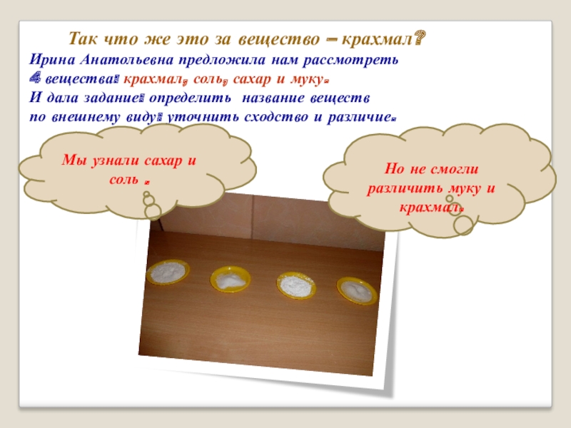 Мы его потрогали и выявили, что крахмал отличается от муки твердостью и характерным поскрипыванием .