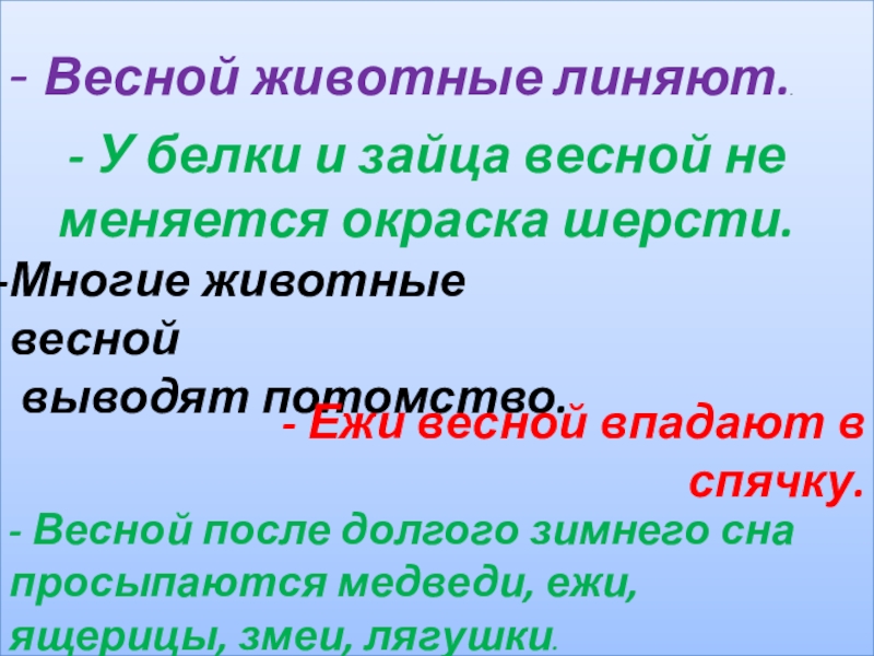 - Весной после долгого зимнего сна просыпаются медведи, ежи, ящерицы, змеи, лягушки.