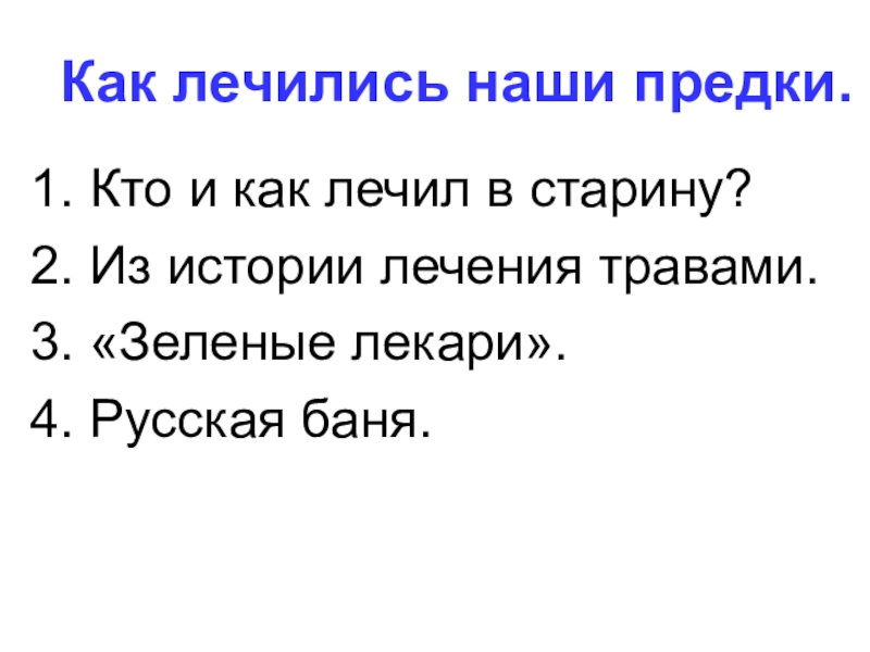 Как лечились наши предки.1. Кто и как лечил в старину?2. Из истории лечения травами.3. «Зеленые лекари».4. Русская