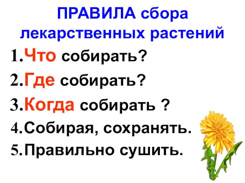ПРАВИЛА сбора лекарственных растенийЧто собирать?Где собирать? Когда собирать ?Собирая, сохранять.Правильно сушить.