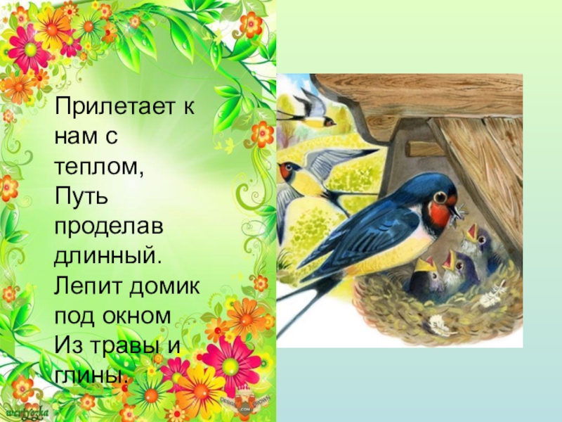 Слайд 10Прилетает к нам с теплом, Путь проделав длинный. Лепит домик под окном Из травы