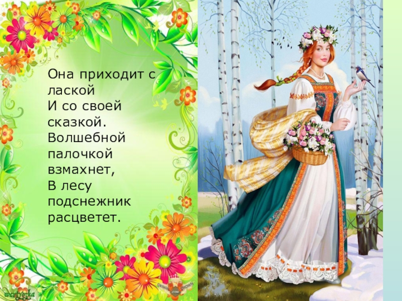 Слайд 3Она приходит с лаской И со своей сказкой. Волшебной палочкой взмахнет, В лесу подснежник