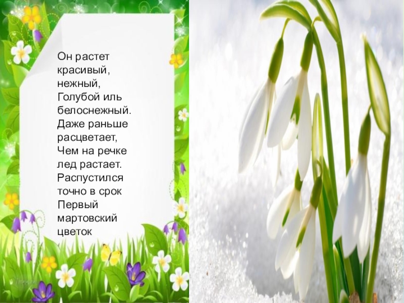 Он растет красивый, нежный,Голубой иль белоснежный.Даже раньше расцветает,Чем на речке лед растает.Распустился точно в срокПервый мартовский цветок