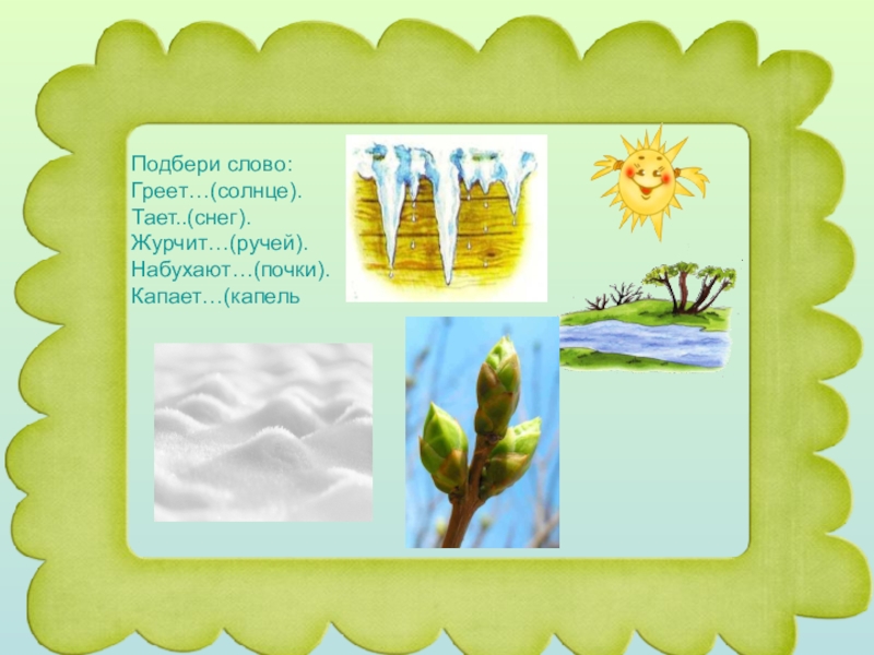 Подбери слово:Греет…(солнце).Тает..(снег).Журчит…(ручей).Набухают…(почки).Капает…(капель