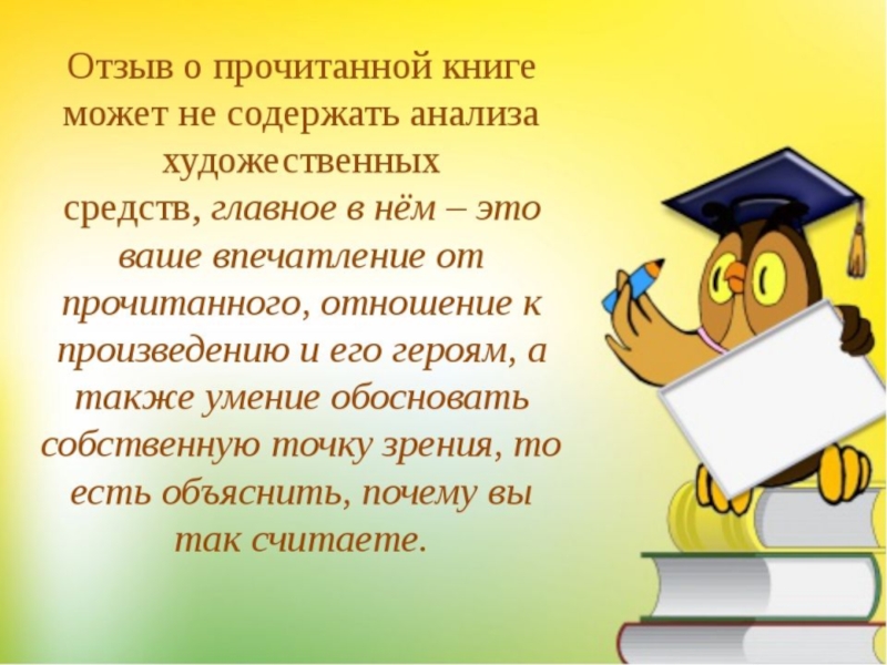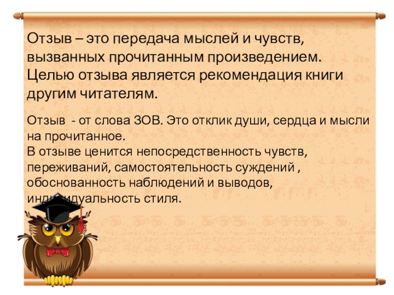 В отзыве ценится непосредственность чувств, переживаний, самостоятельность суждений , обоснованность наблюдений и выводов, индивидуальность стиля.