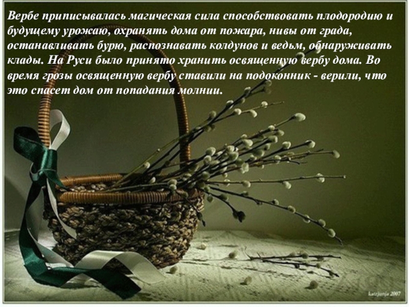 Слайд 6Вербе приписывалась магическая сила способствовать плодородию и будущему урожаю, охранять дома