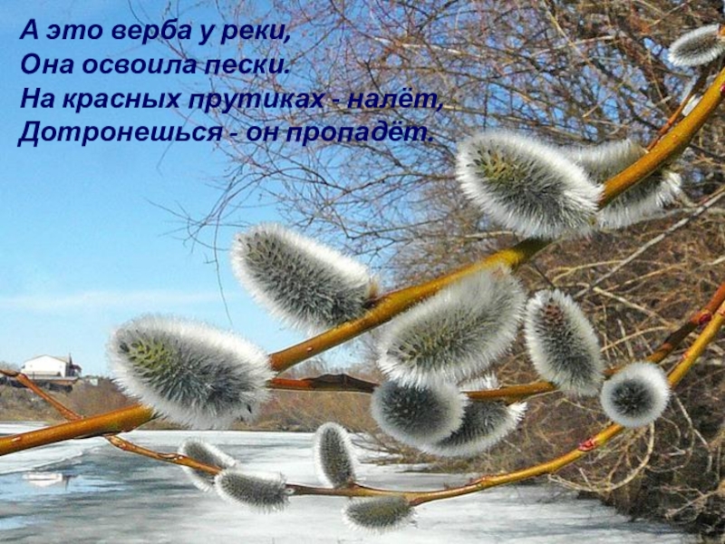 А это верба у реки,Она освоила пески.На красных прутиках - налёт,Дотронешься - он пропадёт.