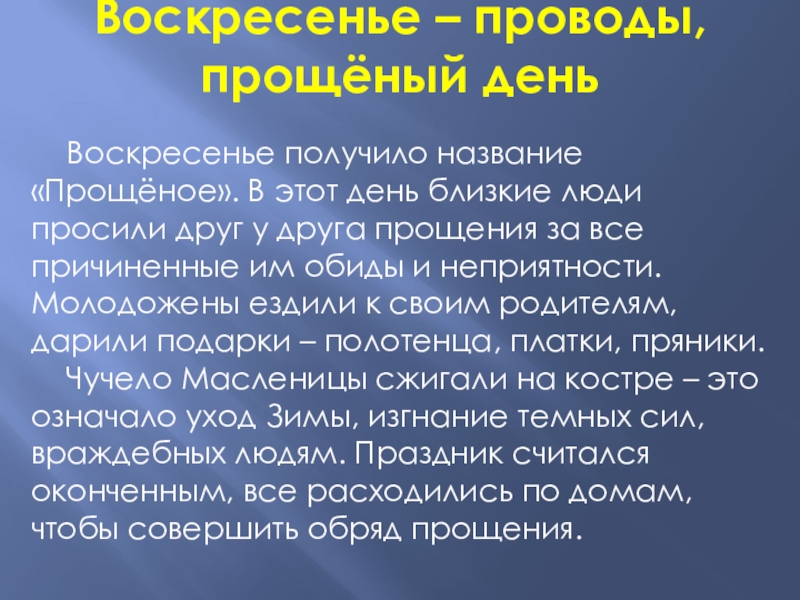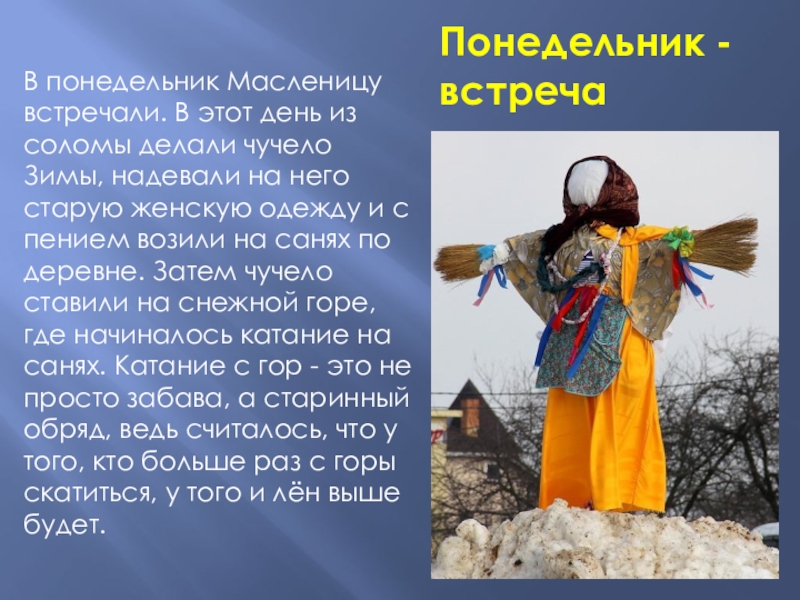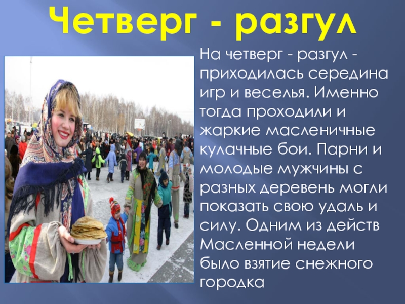 С этого дня по всей деревне начинались разного рода развлечения: катания на санях, народные гулянья, представления скоморохов и кукольных театров во главе с Петрушкой. На улицах расхаживали ряженые, в масках, разъезжавших по знакомым домам, где экспромтом устраивались весёлые домашние концерты. Большими компаниями катались по городу, на тройках и на простых санях.