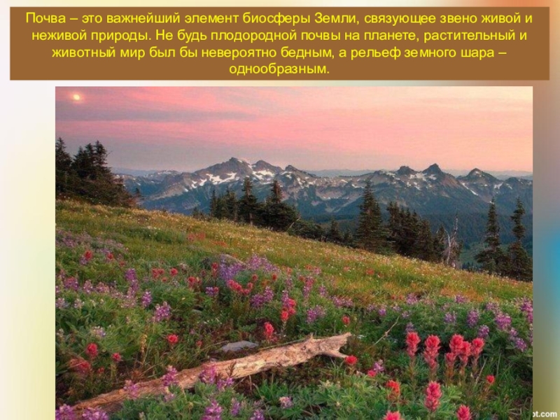 неживой природы. Не будь плодородной почвы на планете, растительный и животный мир был бы невероятно бедным, а рельеф земного шара – однообразным.
