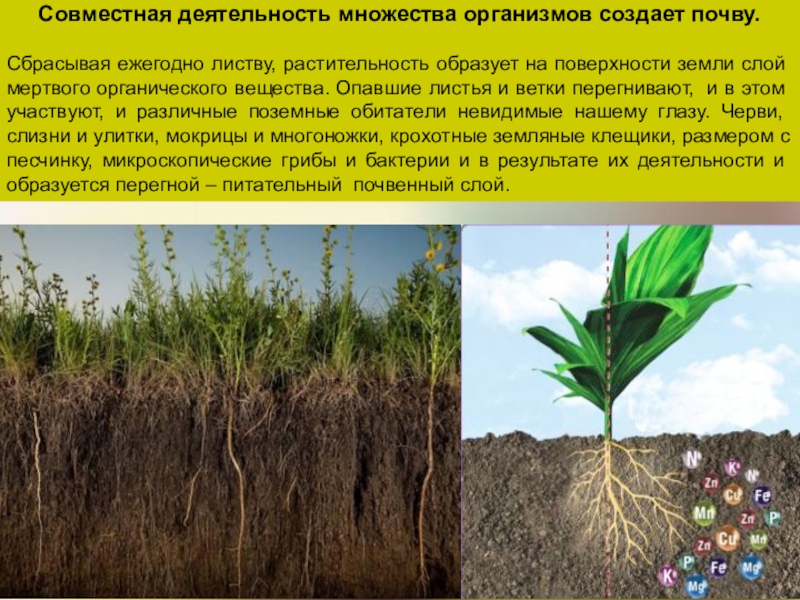 Слайд 25Совместная деятельность множества организмов создает почву.