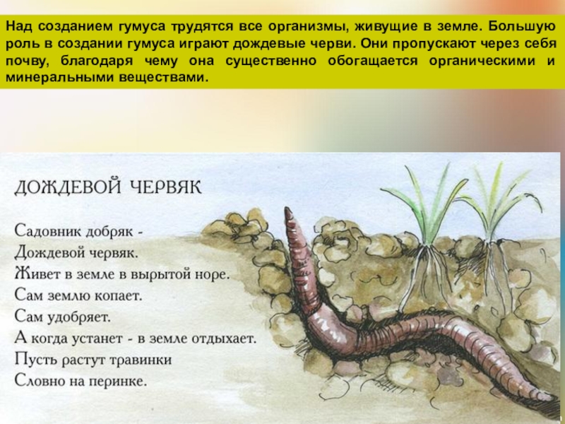 Слайд 26Над созданием гумуса трудятся все организмы, живущие в земле. Большую роль