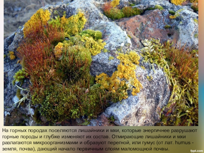 породы и глубже изменяют их состав. Отмирающие лишайники и мхи разлагаются микроорганизмами и образуют перегной, или гумус (от лат. humus - земля, почва), дающий начало первичным слоям маломощной почвы.