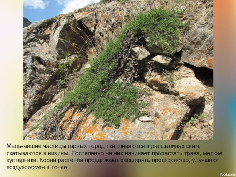 Слайд 16Мельчайшие частицы горных пород скапливаются в расщелинах скал, скатываются в низины.