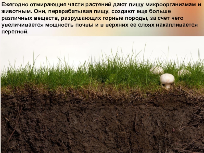 Слайд 17Ежегодно отмирающие части растений дают пищу микроорганизмам и животным. Они, перерабатывая