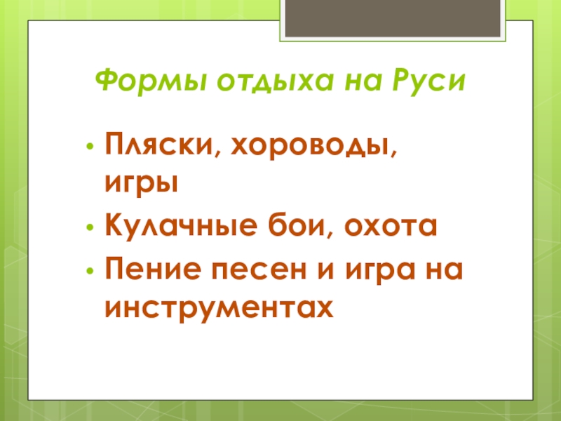 Формы отдыха на РусиПляски, хороводы, игрыКулачные бои, охотаПение песен и игра на инструментах