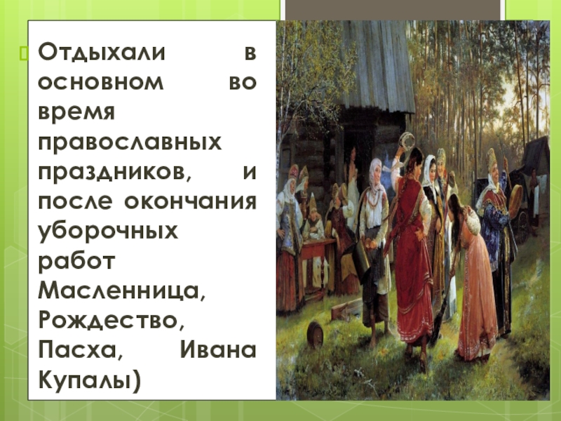 Отдыхали в основном во время православных праздников, и после окончания уборочных работ Масленница, Рождество, Пасха,