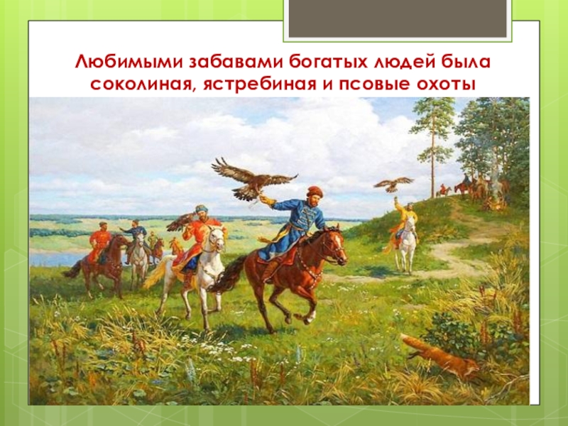 Слайд 6Любимыми забавами богатых людей была соколиная, ястребиная и псовые охоты