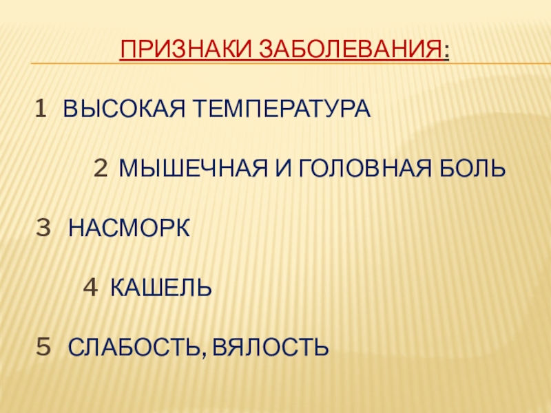 Высокая температура 2 Мышечная и головная боль 3 Насморк 4 Кашель 5 Слабость, вялость