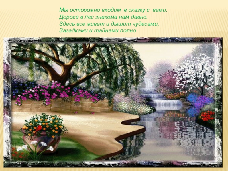 Мы осторожно входим в сказку с вами. Дорога в лес знакома нам давно. Здесь все живет и дышит чудесами, Загадками и тайнами полно