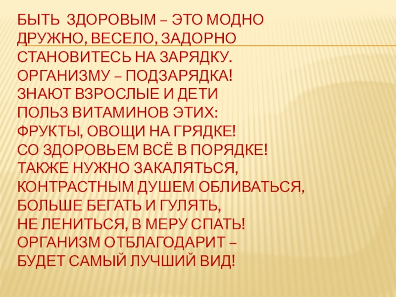 взрослые и дети Польз витаминов этих: Фрукты, овощи на грядке! Со здоровьем всё в порядке! Также нужно закаляться, Контрастным душем обливаться, Больше бегать и гулять, Не лениться, в меру спать! Организм отблагодарит – Будет самый лучший вид!