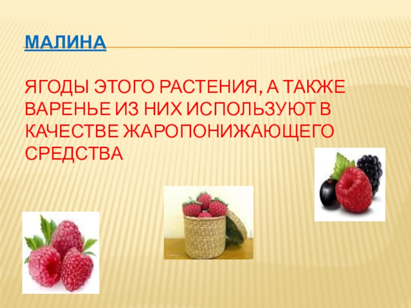 Слайд 15 Малина Ягоды этого растения, а также варенье из них используют в качестве