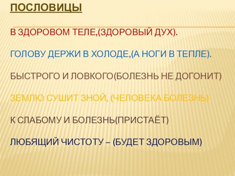 Слайд 21 Пословицы В здоровом теле,(здоровый дух). Голову держи в холоде,(а ноги в тепле). Быстрого и