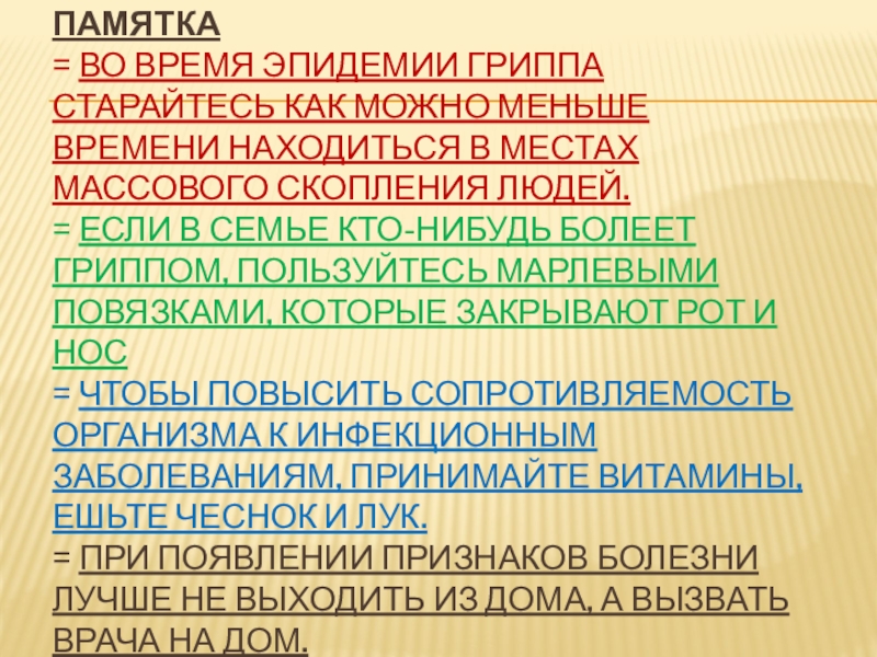 Памятка = Во время эпидемии гриппа старайтесь как можно меньше времени находиться в местах массового скопления людей.