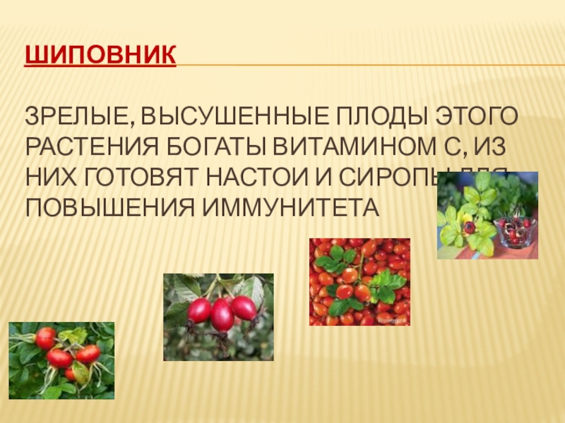 Слайд 16 Шиповник Зрелые, высушенные плоды этого растения богаты витамином С, из них готовят
