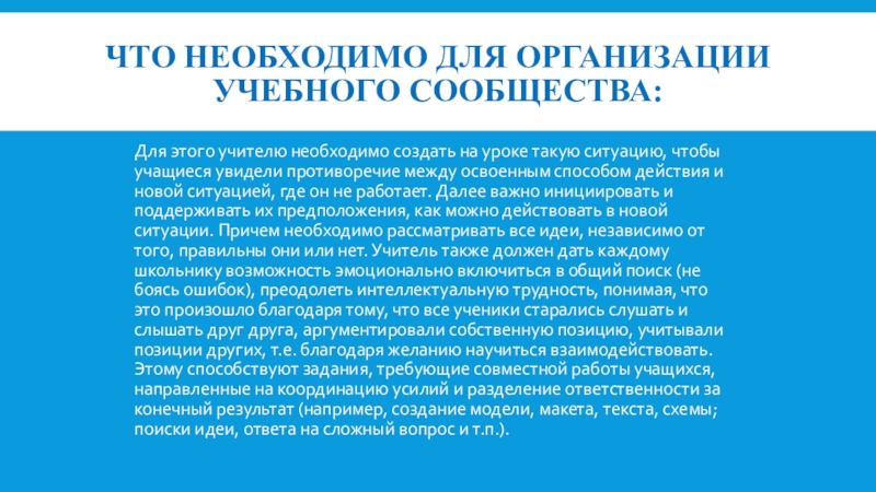 уроке такую ситуацию, чтобы учащиеся увидели противоречие между освоенным способом действия и новой ситуацией, где он не работает. Далее важно инициировать и поддерживать их предположения, как можно действовать в новой ситуации. Причем необходимо рассматривать все идеи, независимо от того, правильны они или нет. Учитель также должен дать каждому школьнику возможность эмоционально включиться в общий поиск (не боясь ошибок), преодолеть интеллектуальную трудность, понимая, что это произошло благодаря тому, что все ученики старались слушать и слышать друг друга, аргументировали собственную позицию, учитывали позиции других, т.е. благодаря желанию научиться взаимодействовать. Этому способствуют задания, требующие совместной работы учащихся, направленные на координацию усилий и разделение ответственности за конечный результат (например, создание модели, макета, текста, схемы; поиски идеи, ответа на сложный вопрос и т.п.).
