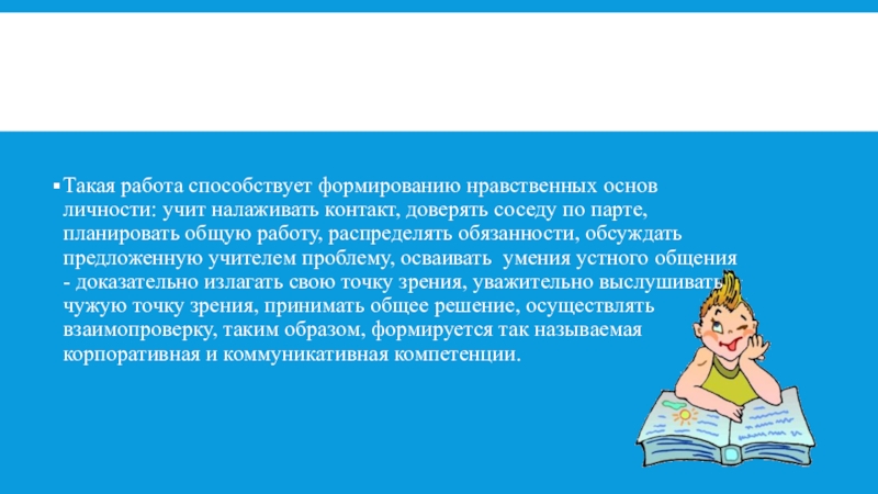 Слайд 8Такая работа способствует формированию нравственных основ личности: учит налаживать контакт, доверять