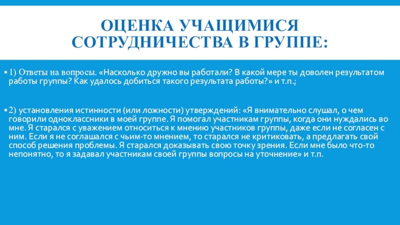 2) установления истинности (или ложности) утверждений: «Я внимательно слушал, о чем говорили одноклассники в моей группе. Я помогал участникам группы, когда они нуждались во мне. Я старался с уважением относиться к мнению участников группы, даже если не согласен с ним. Если я не соглашался с чьим-то мнением, то старался не критиковать, а предлагать свой способ решения проблемы. Я старался доказывать свою точку зрения. Если мне было что-то непонятно, то я задавал участникам своей группы вопросы на уточнение» и т.п.