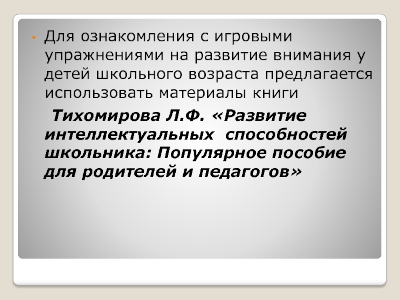 Слайд 28Для ознакомления с игровыми упражнениями на развитие внимания у детей школьного