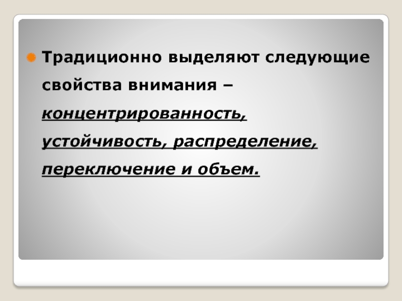 Традиционно выделяют следующие свойства внимания – концентрированность, устойчивость, распределение, переключение и
