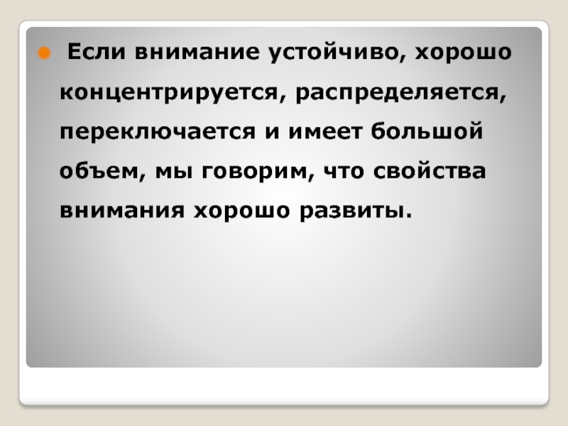 Слайд 12 Если внимание устойчиво, хорошо концентрируется, распределяется, переключается и имеет большой