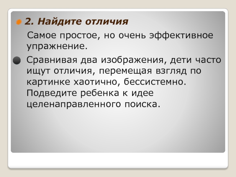 изображения, дети часто ищут отличия, перемещая взгляд по картинке хаотично, бессистемно. Подведите ребенка к идее целенаправленного поиска.