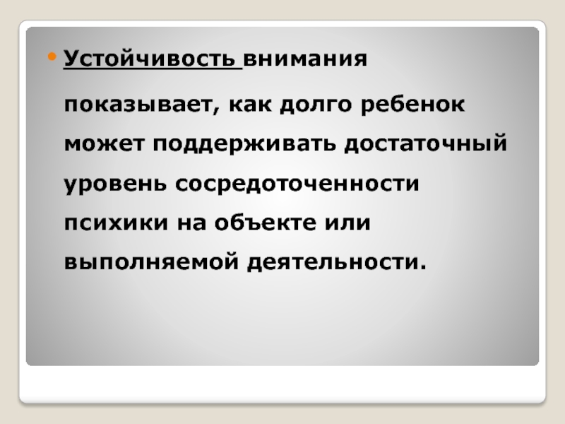 Слайд 7Устойчивость внимания показывает, как долго ребенок может поддерживать достаточный уровень сосредоточенности