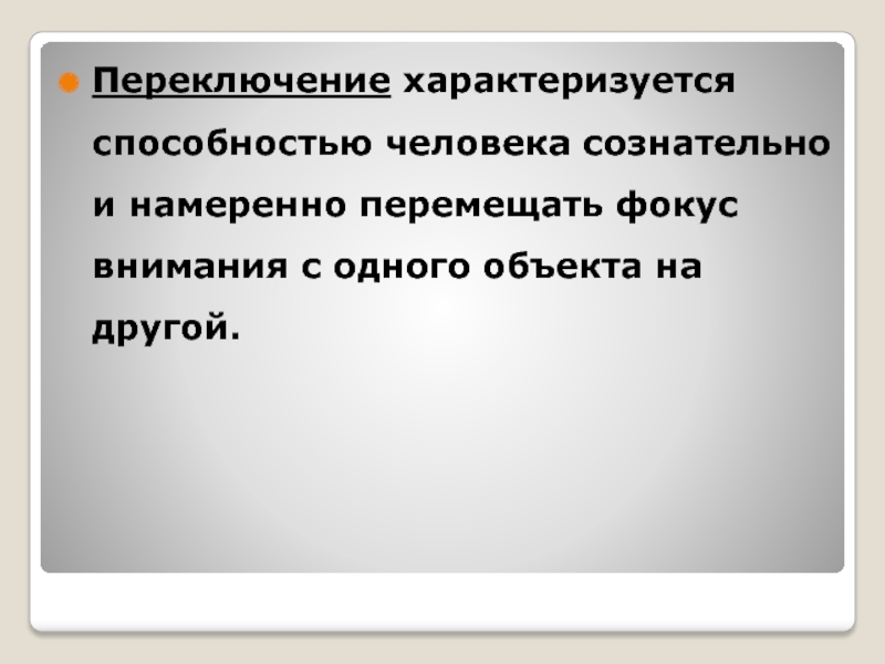 Слайд 11Переключение характеризуется способностью человека сознательно и намеренно перемещать фокус внимания с