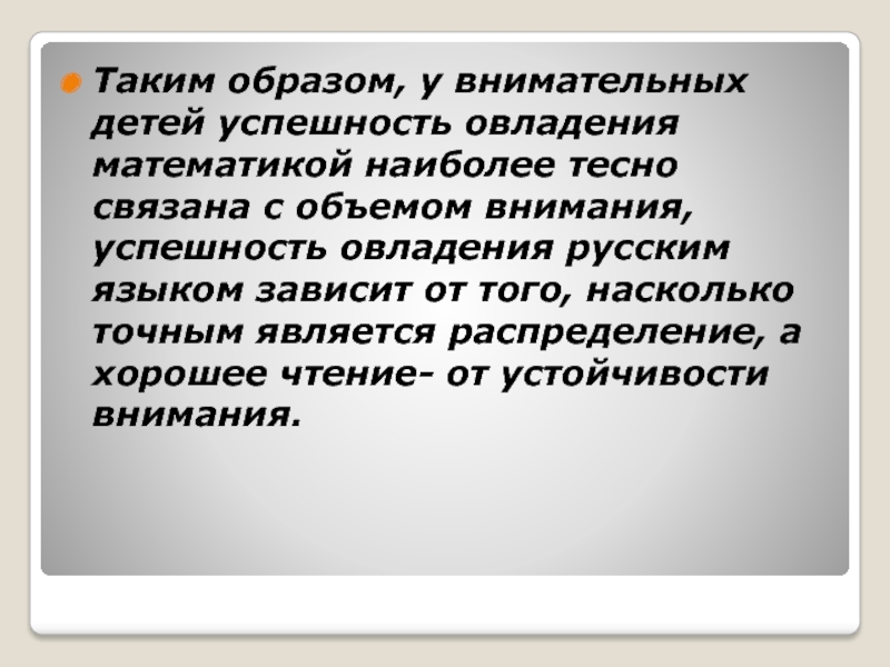 Слайд 14Таким образом, у внимательных детей успешность овладения математикой наиболее тесно связана