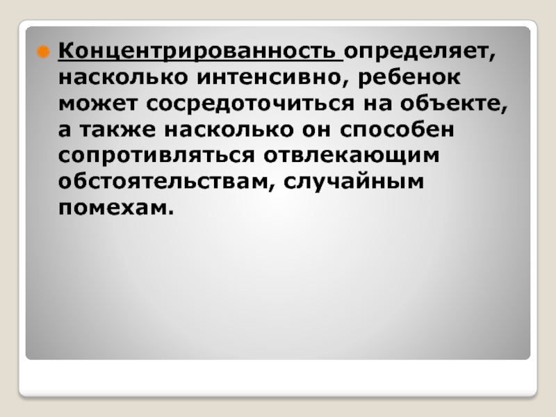 Слайд 6Концентрированность определяет, насколько интенсивно, ребенок может сосредоточиться на объекте, а также