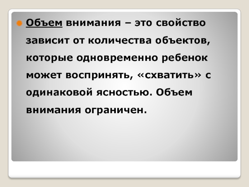 Слайд 10Объем внимания – это свойство зависит от количества объектов, которые одновременно