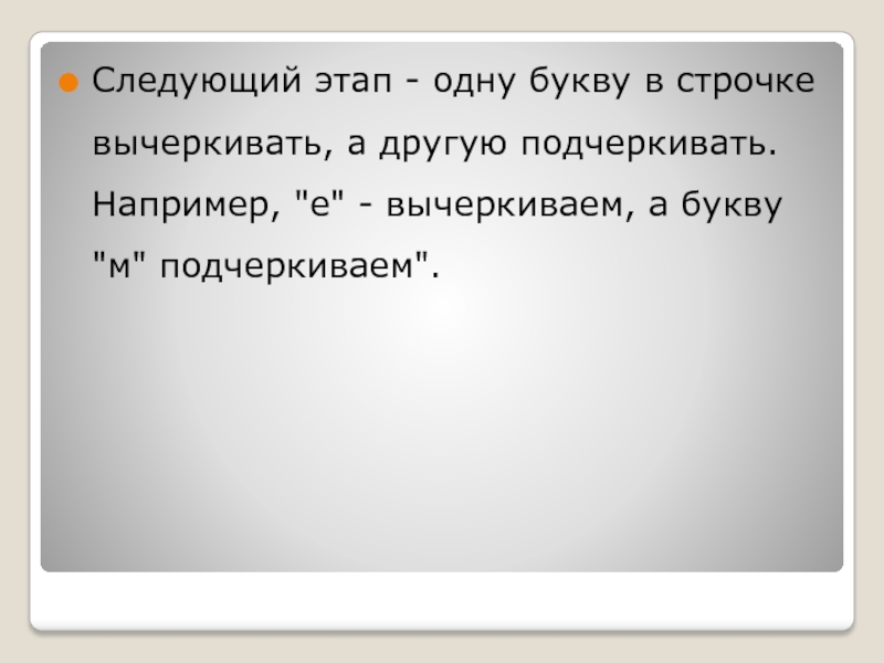 Слайд 27Следующий этап - одну букву в строчке вычеркивать, а другую подчеркивать.