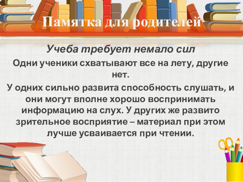 У одних сильно развита способность слушать, и они могут вполне хорошо воспринимать информацию на слух. У других же развито зрительное восприятие – материал при этом лучше усваивается при чтении.