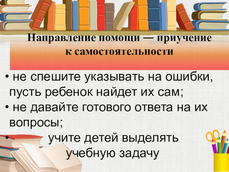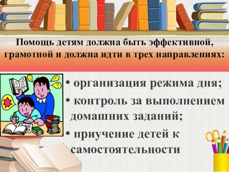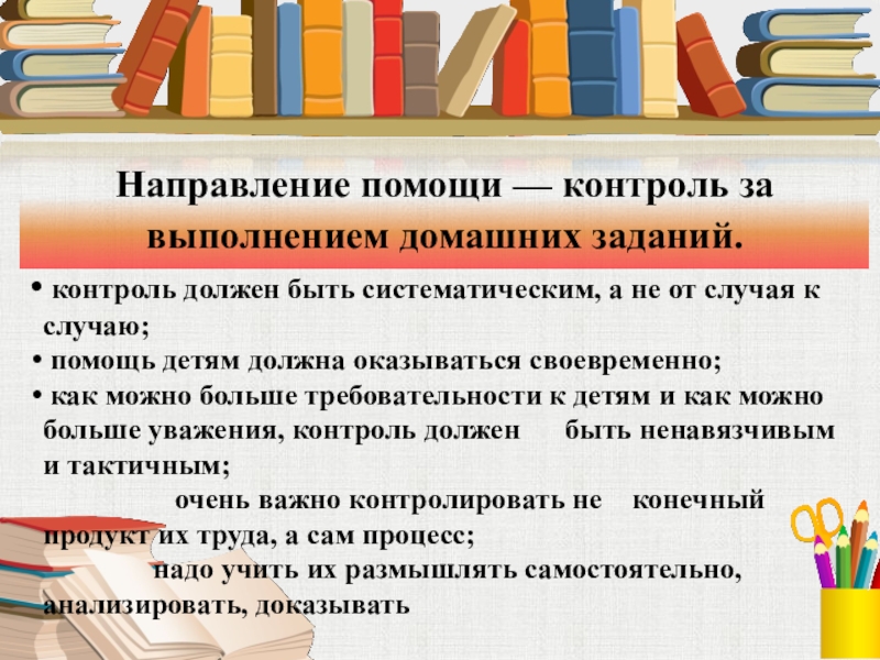 Слайд 14Направление помощи — контроль за выполнением домашних заданий.