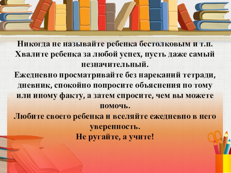 Слайд 15Никогда не называйте ребенка бестолковым и т.п.