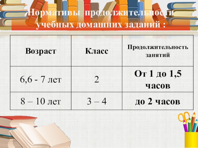 Слайд 9Нормативы продолжительности учебных домашних заданий :