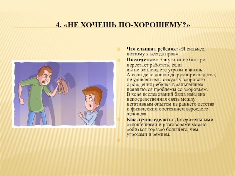 перестает работать, если вы не воплощаете угрозы в жизнь. А если дело дошло до рукоприкладства, не удивляйтесь, откуда у здорового с рождения ребенка в дальнейшем появляются проблемы со здоровьем. В ходе исследований была найдена непосредственная связь между негативным опытом из раннего детства и физическим состоянием взрослого человека.