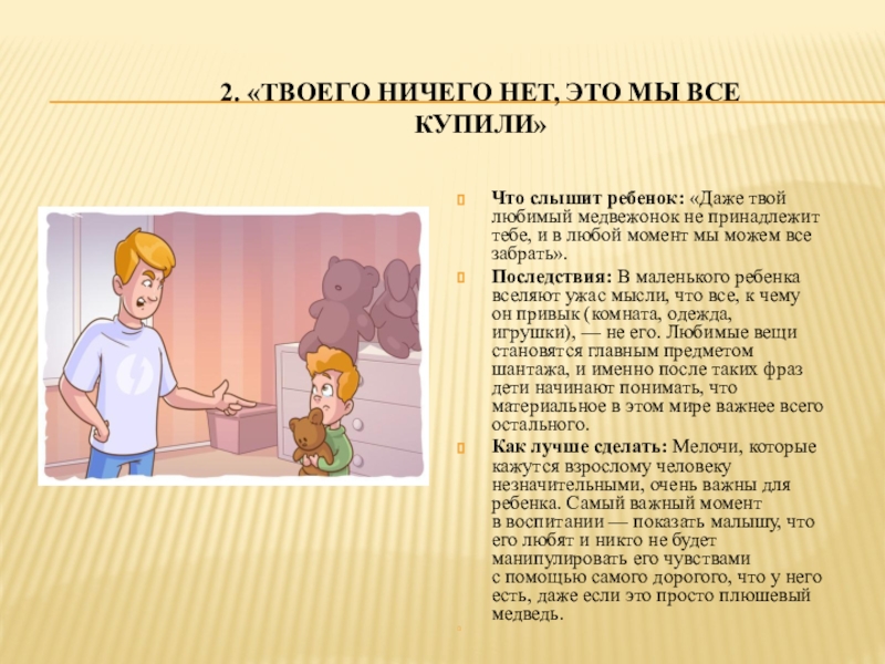 Последствия: В маленького ребенка вселяют ужас мысли, что все, к чему он привык (комната, одежда, игрушки), — не его. Любимые вещи становятся главным предметом шантажа, и именно после таких фраз дети начинают понимать, что материальное в этом мире важнее всего остального.