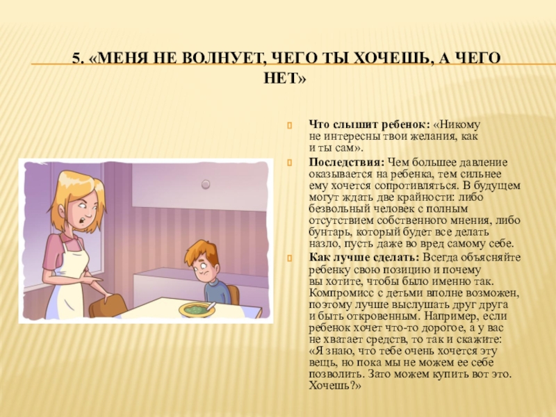 Как лучше сделать: Всегда объясняйте ребенку свою позицию и почему вы хотите, чтобы было именно так. Компромисс с детьми вполне возможен, поэтому лучше выслушать друг друга и быть откровенным. Например, если ребенок хочет что-то дорогое, а у вас не хватает средств, то так и скажите: «Я знаю, что тебе очень хочется эту вещь, но пока мы не можем ее себе позволить. Зато можем купить вот это. Хочешь?»