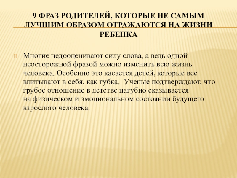 слова, а ведь одной неосторожной фразой можно изменить всю жизнь человека. Особенно это касается детей, которые все впитывают в себя, как губка. Ученые подтверждают, что грубое отношение в детстве пагубно сказывается на физическом и эмоциональном состоянии будущего взрослого человека.